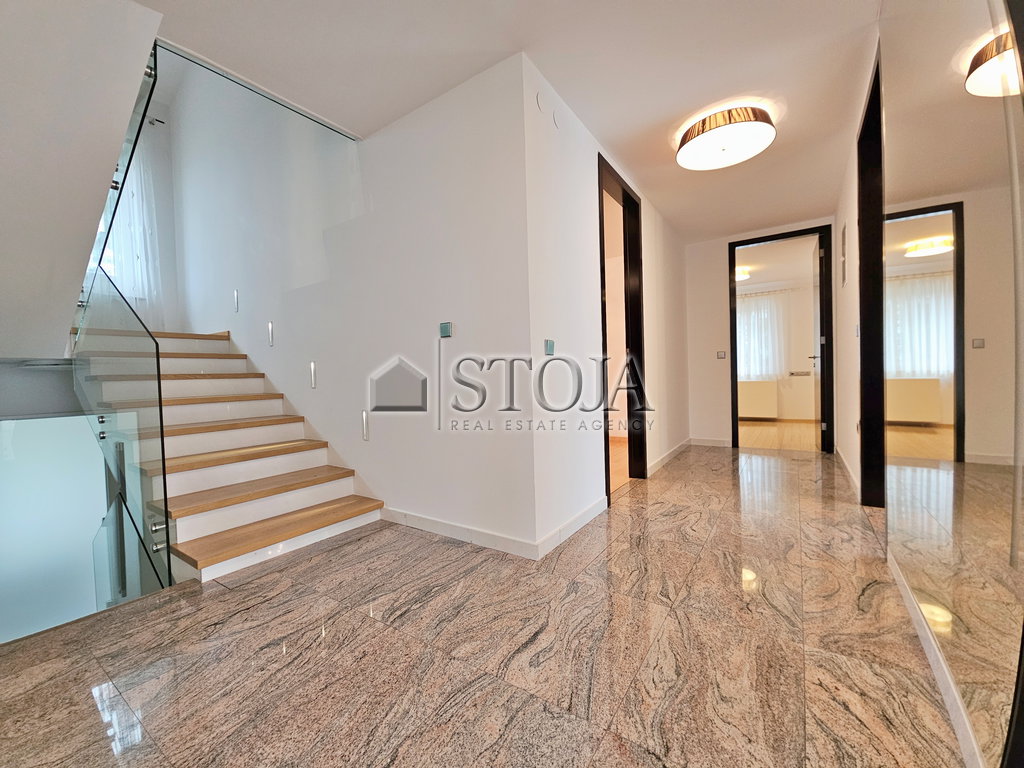 Thanks to the connection between the ground floor areas and the exceptionally well-maintained and spacious garden, the house is ideal for organizing larger receptions and events. All paved surfaces around the buildings are finished with polished concrete.