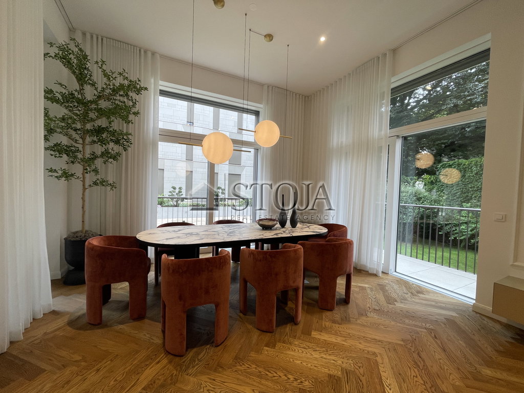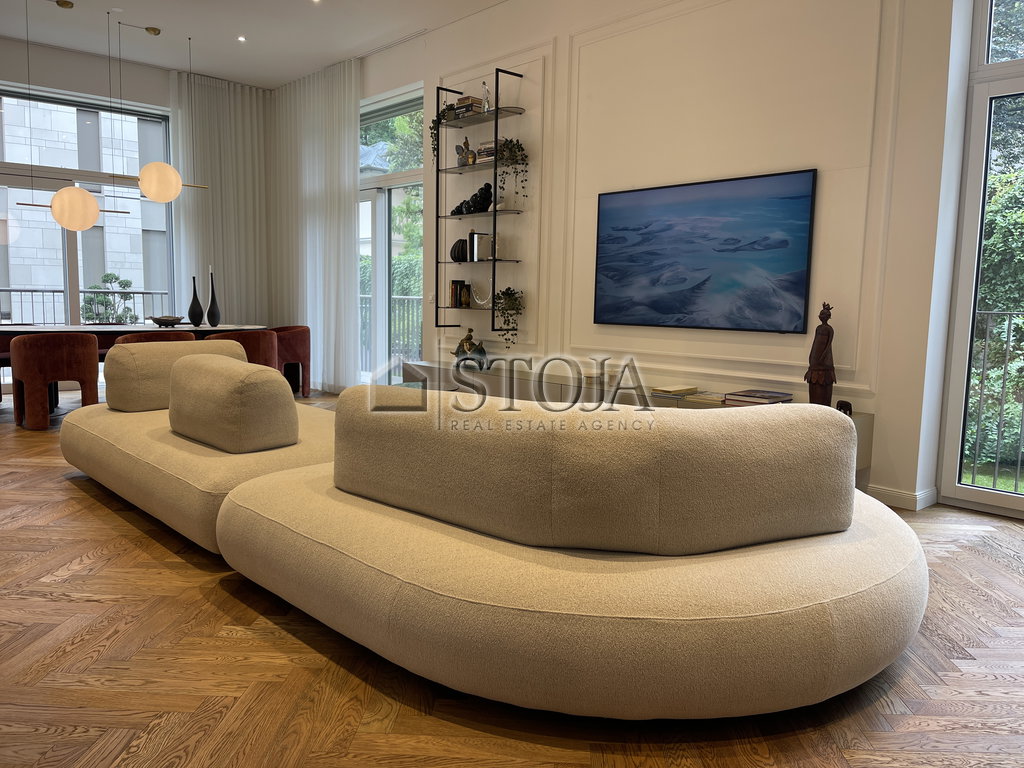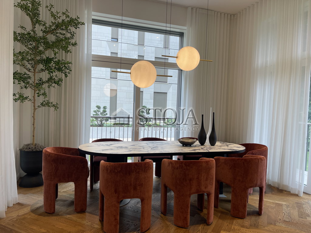 The centerpiece of the apartment is the luxurious living room, designed with pieces from top Italian manufacturers and custom-made elements. The dining area is adorned with an oval dining table made of black veneer with an impressive Calacatta Viola ceramic top, surrounded by eight velvet Cali chairs by Dietre. Above the table hang prestigious IL FANALE lamps, creating an ambiance of two planets in the room.
