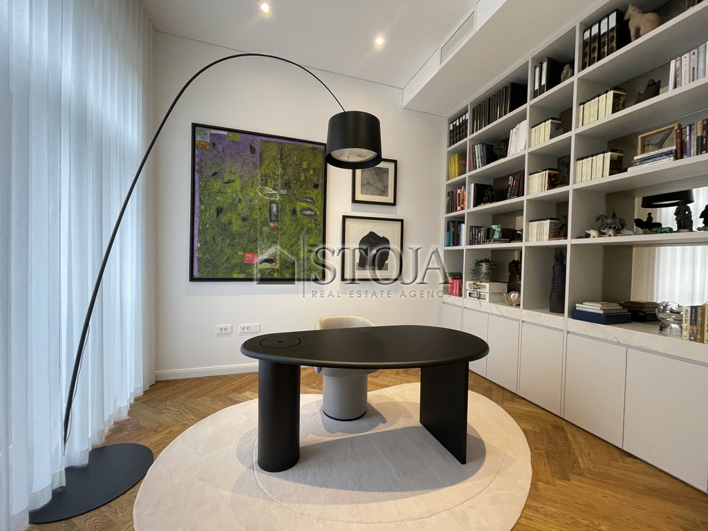In the living area stands out a monumental Dietre sofa in light boucle fabric with a lounge part diameter of 2.2 m and movable backs. The space is enriched by a silk Persian rug, designer club tables Mushroom (Paolo Vella & Ellen Bernhard for Calligaris), a Samsung The Frame TV, and carefully selected artworks, including sculptures by Ljubica Kočica.