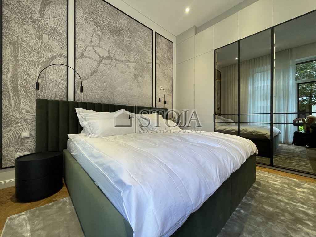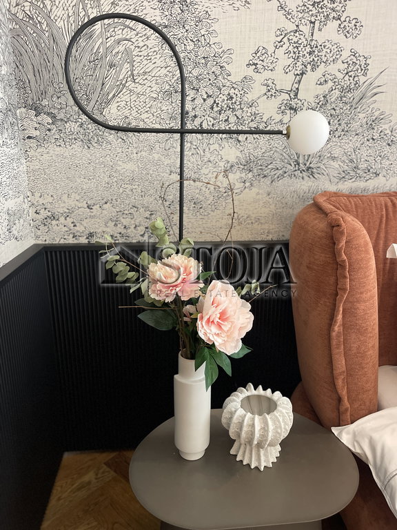 The bedroom is designed as a retreat into luxury. Built-in wardrobes up to 3.3 m high offer plenty of space. The centerpiece is a bed measuring 200 x 200 cm with a soft upholstered headboard, accompanied by Dedalo nightstands from the Italian brand Pianca. Special elegance is provided by Poppy wallpaper in a black frame and an oval veneer dresser with a stone top and Merlaki handles. The apartment is equipped with quality mattresses, four sets of satin bedding, and quilted blankets and pillows filled with Siberian down.