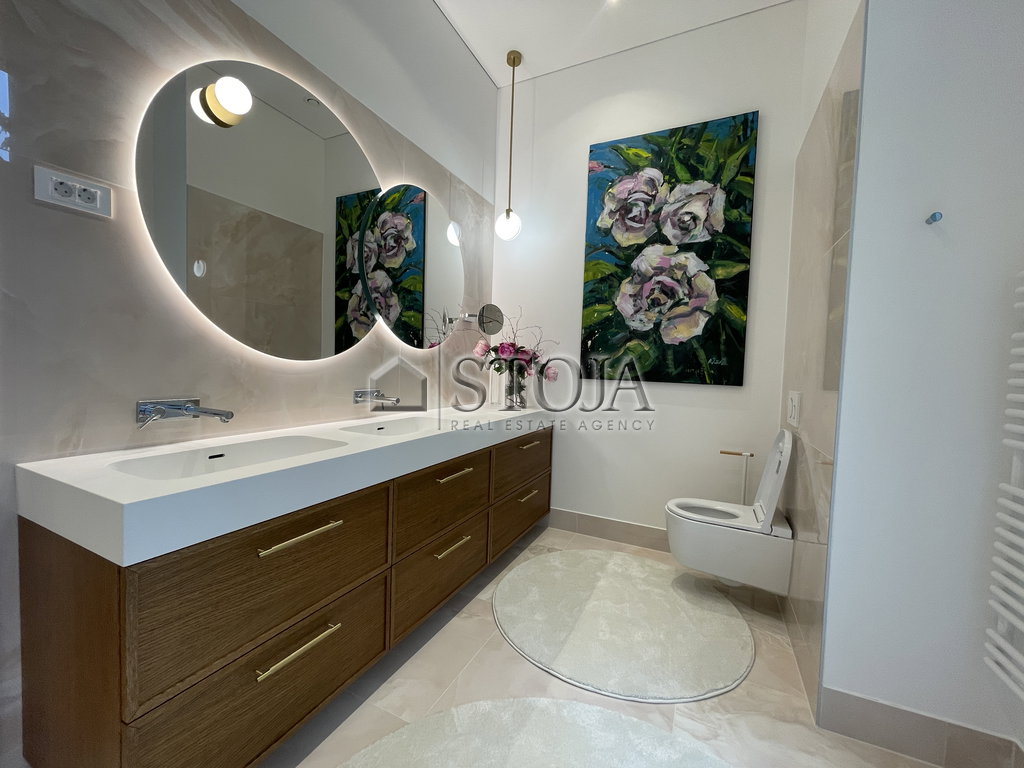 The bathroom adjoining the bedroom impresses with a double stone sink built into oak veneer furniture. The space is enriched with an artwork by a Slovenian author featuring a floral motif.