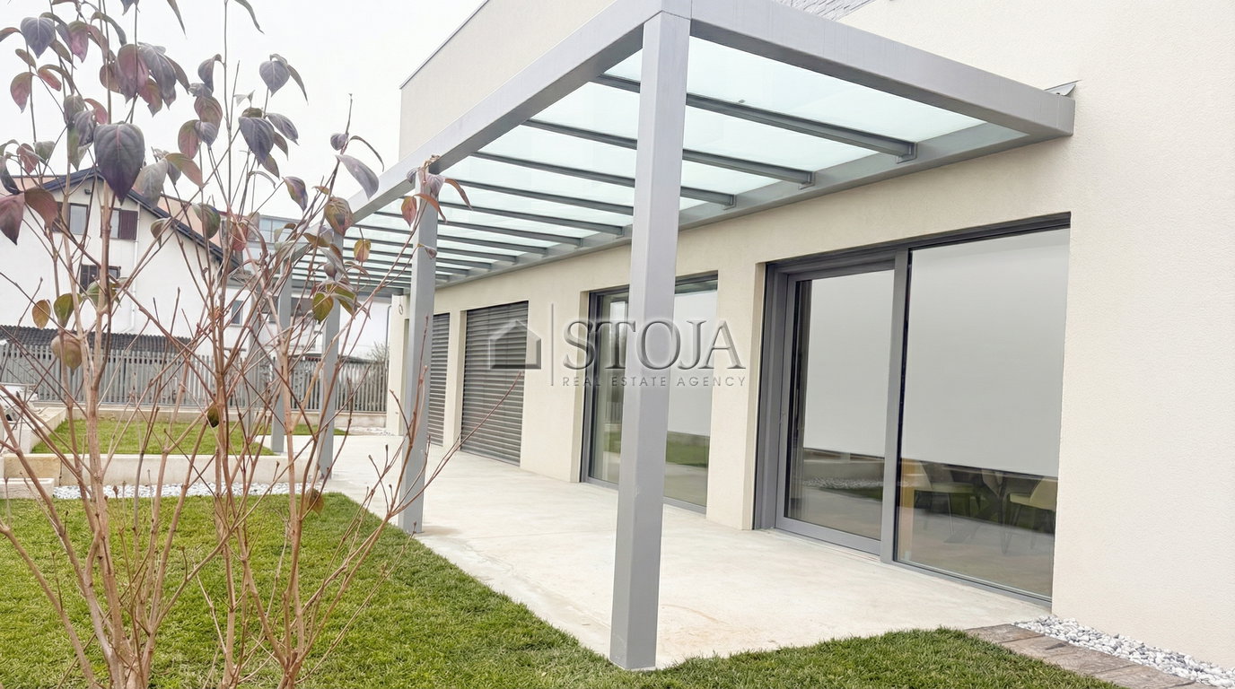It spreads over 119.6 m2 of usable area, with the ground floor offering a spacious entrance hall with built-in wardrobes, an elegant bathroom, a storage room, and a beautiful kitchen with dining and living room, from which doors open onto a covered terrace and a 66 m² atrium – ideal for socializing or complete outdoor tranquility.