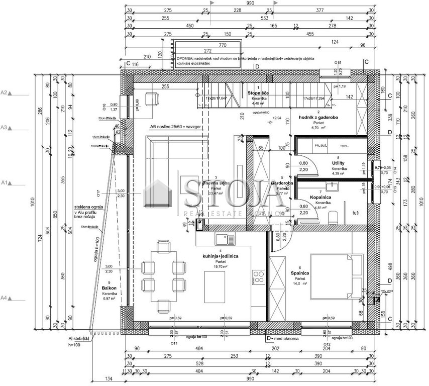 entrance with antechamber, staircase, larger open space with access to the balcony, additional room, cloakroom, utility room, and bathroom.