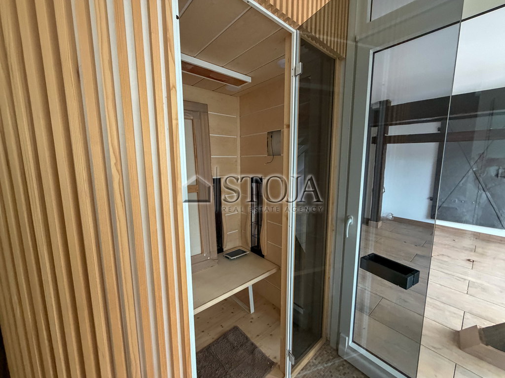 1st floor: entrance hall, spacious kitchen connected to the dining room and living room with a fireplace and access to a covered balcony, walk-in closet, sauna + shower, terrace, and 2 balconies,