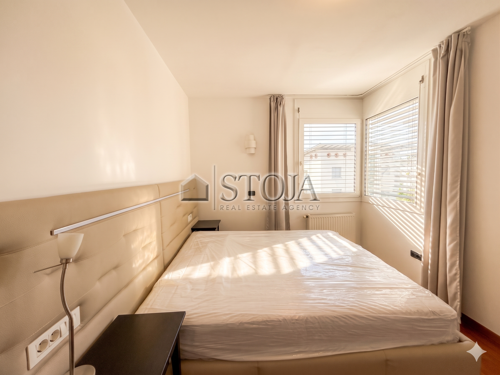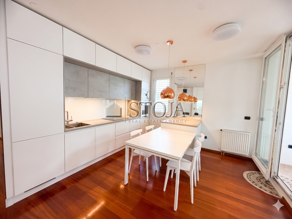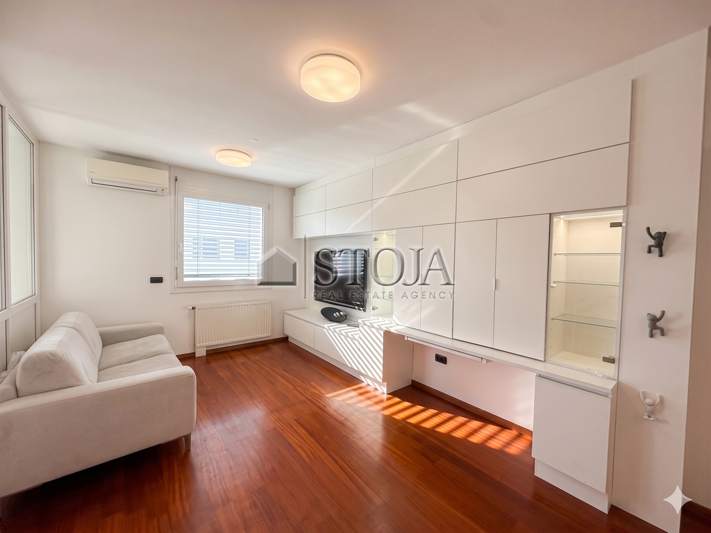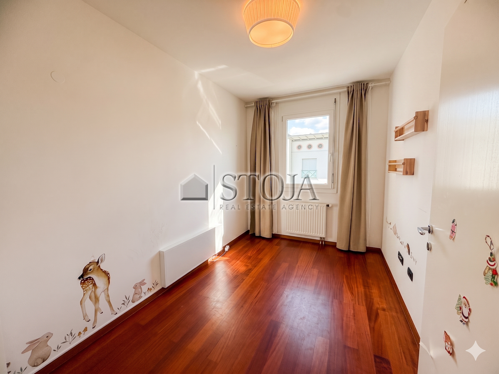 The floor plan is thoughtfully designed and extremely functional. Upon entering, you are welcomed by a spacious hallway with built-in wardrobes that provide plenty of storage space. The spacious custom-made kitchen is perfect for pleasant family lunches or dinners with friends. The living area is bright and airy, with a designated work corner and also has access to a 4 m² loggia.