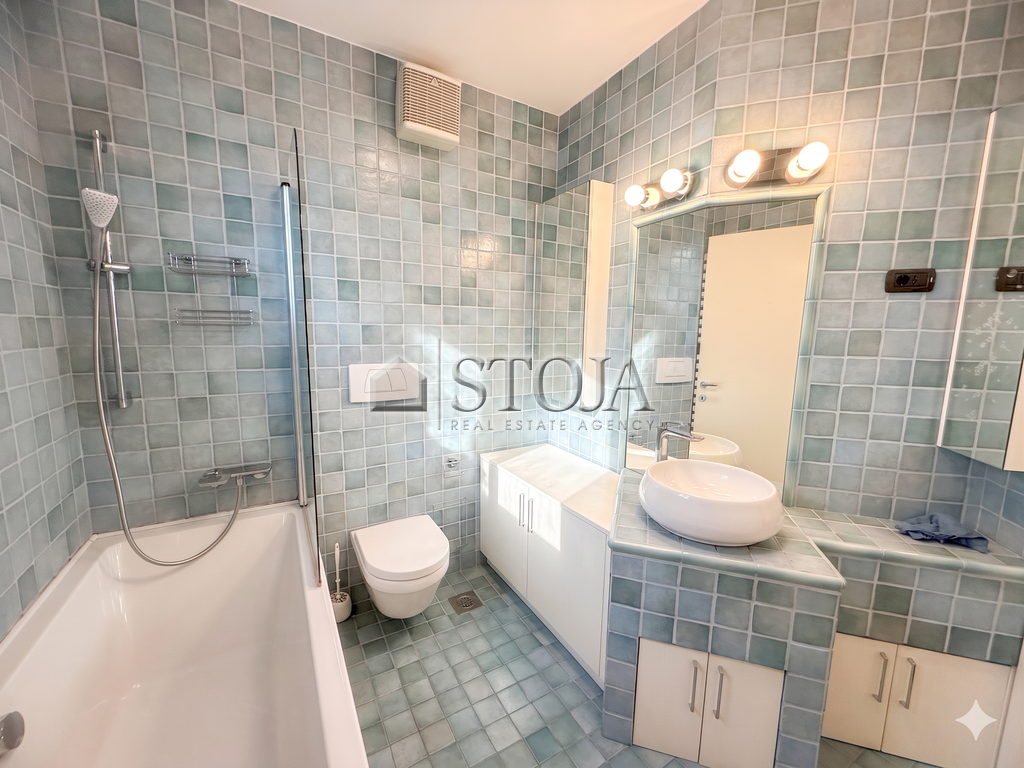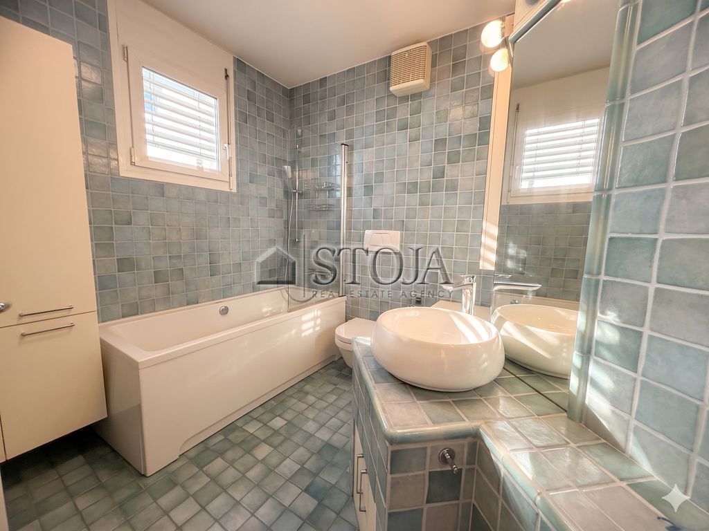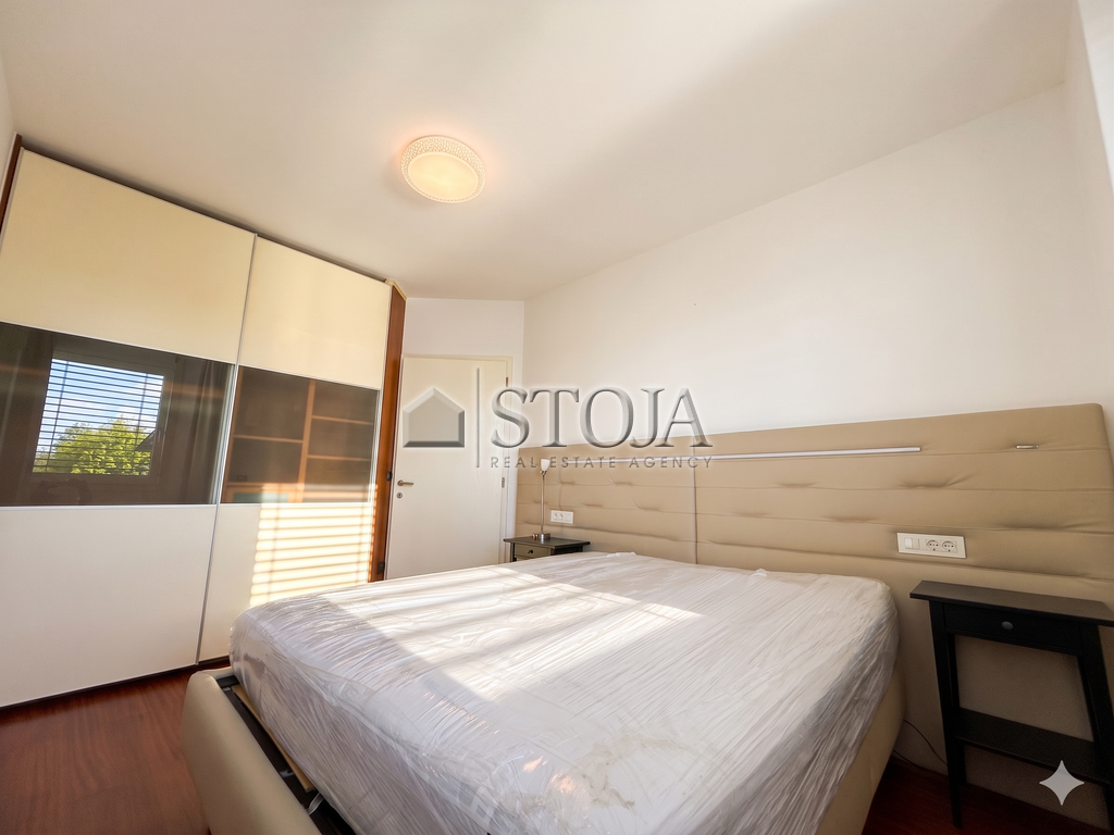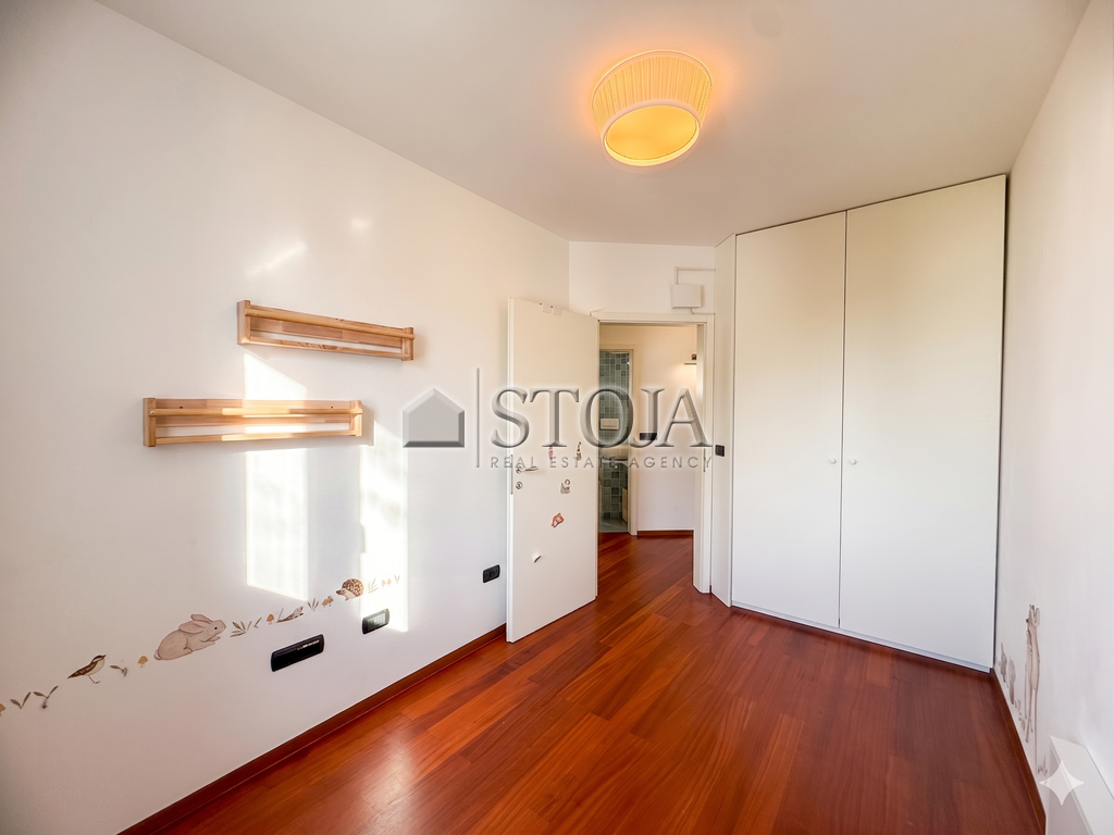 The floor plan is thoughtfully designed and extremely functional. Upon entering, you are welcomed by a spacious hallway with built-in wardrobes that provide plenty of storage space. The spacious custom-made kitchen is perfect for pleasant family lunches or dinners with friends. The living area is bright and airy, with a designated work corner and also has access to a 4 m² loggia.