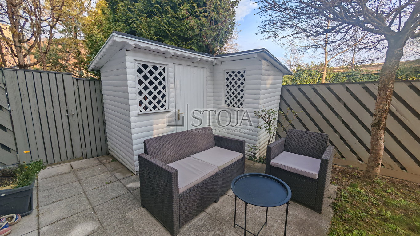 The garden is carefully maintained and fenced. Next to the house, there is a wooden garden shed with terrace furniture, providing plenty of privacy and representing an ideal space for socializing or relaxation.