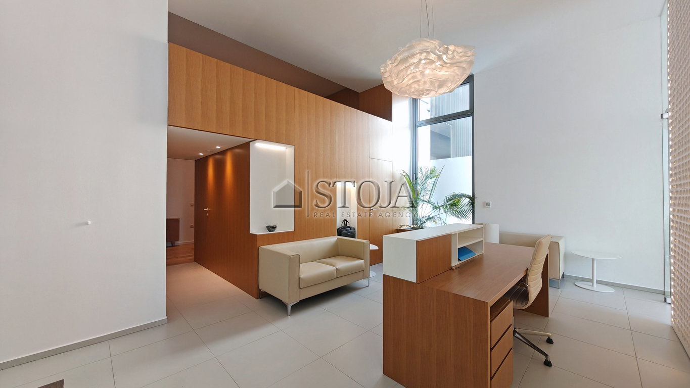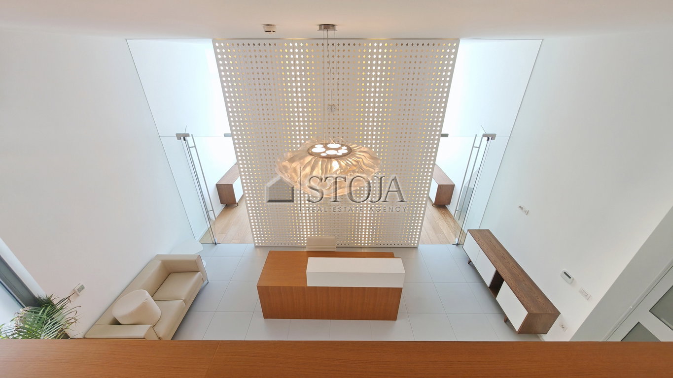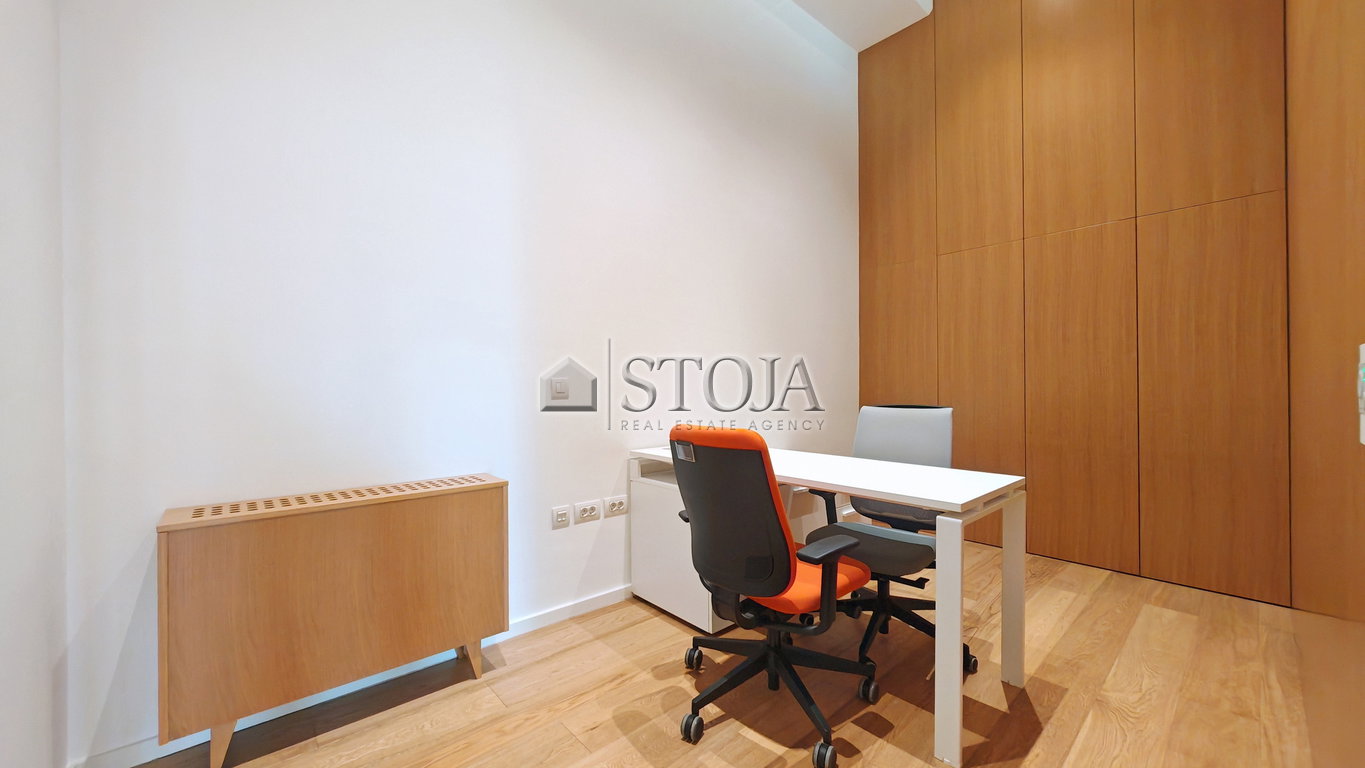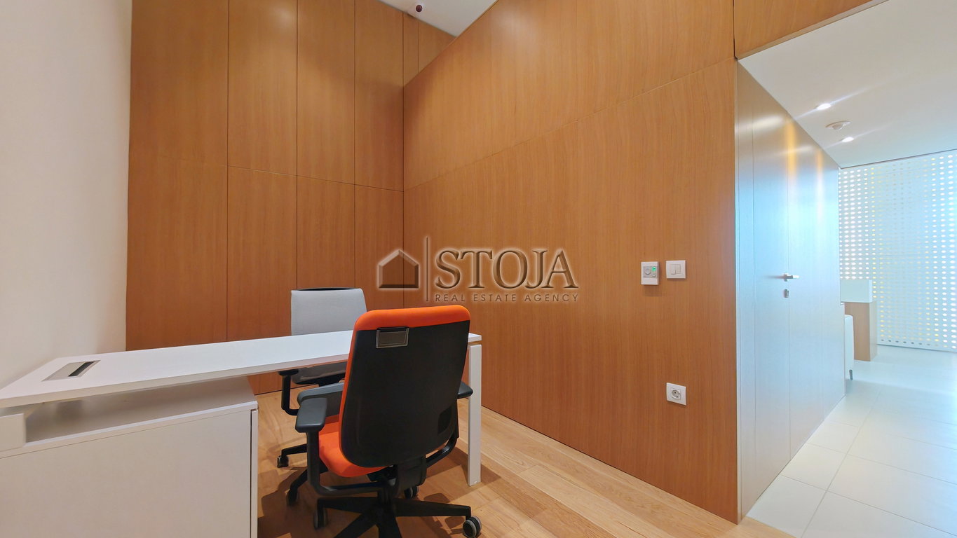 The offices feature good visibility from the passing road, custom-made equipment, ample storage cabinets, high ceilings (3.7 m), central heating and cooling, disabled access, central ventilation with heat recovery, easy access from the highway, etc.