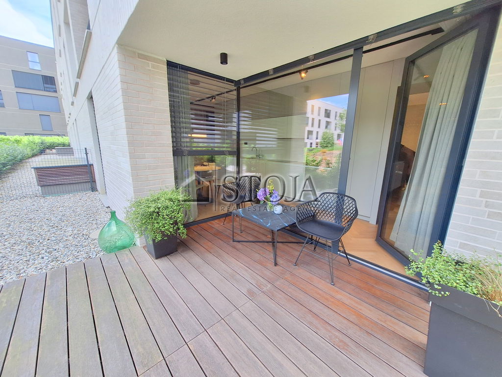 Funkcionalni in premišljeni tloris stanovanja vključuje predsobo, kuhinjo z jedilnico ter dnevno sobo z izhodom na atrij, spalnico in kopalnico. Atrij je opremljen z delno položenim lesenim delom iz bambusa, ki dopolnjuje zelenico okolice. Poleg tega stanovanju pripadata parkirno mesto v kletni etaži objekta ter shramba.
