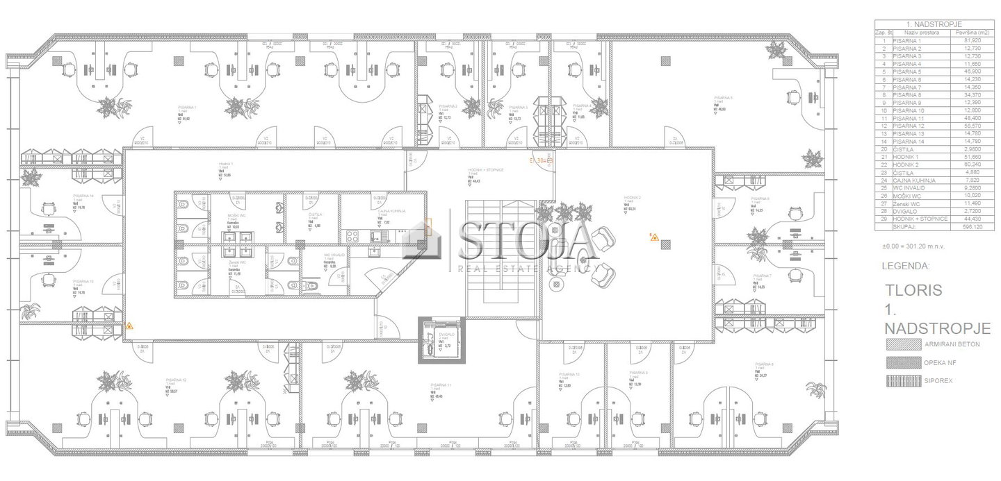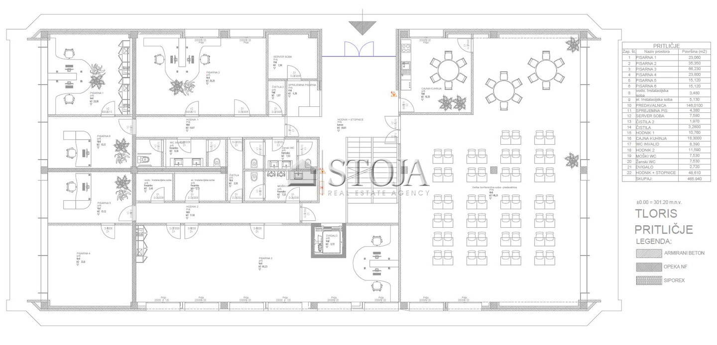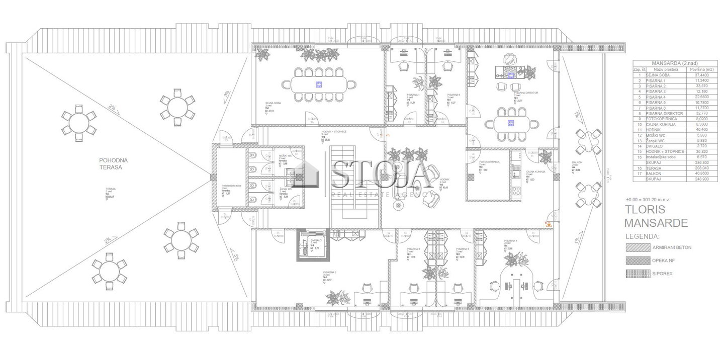 Objekt obsega tri etaže in sicer pritličje (466 m2), 1. nadstropje (596 m2) in 2. nadstropje (287 m2), ki obsega tudi dve terasi in sicer večjo s cca. 208 m2 in manjšo s cca. 40 m2 površine.