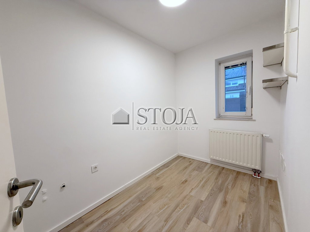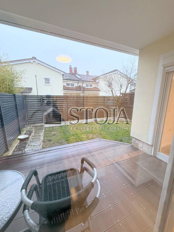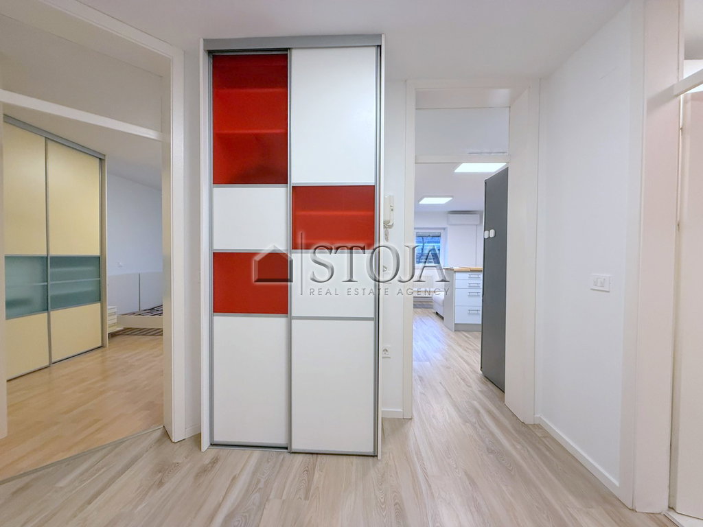 Stanovanje obsega odprt dnevno-bivalni prostor s sodobno opremljeno kuhinjo in jedilnico, ločeno spalnico z izhodom v atrij, kabinet (neopremljen), primeren za otroško sobo ali domačo pisarno, ter popolnoma prenovljeno kopalnico s talnim gretjem. Stanovanju pripada tudi shramba.